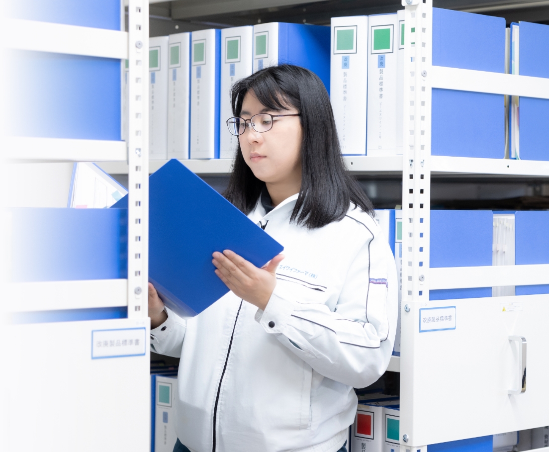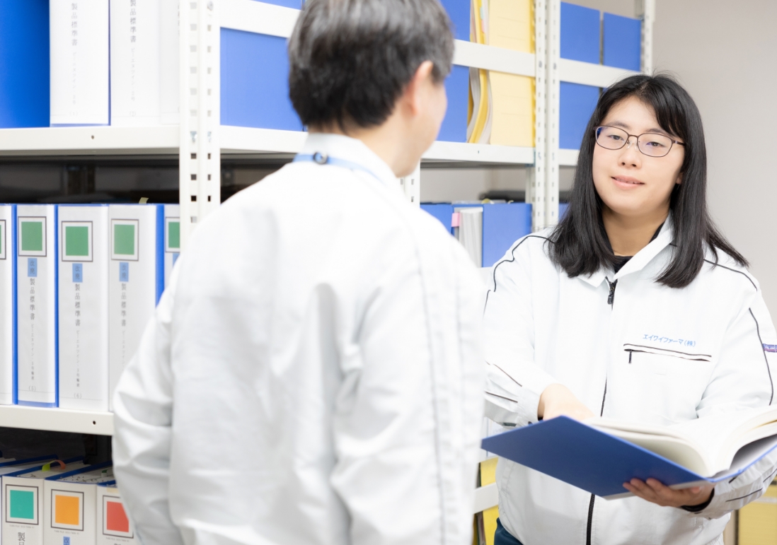 医薬品製造におけるGMP省令などを守った、安全な製品を出荷する判断をするための部署に所属しています。現在は、製造部署の1ラインを担当し、製品が問題なく安全であることを判断するために、製造する際の原料や容器、機械、製造手順やその記録が正式な手順で使用・記録されているかを確認しています。記録書に省略されている手順や、記録書には記載があるけれども実際はなされていない手順がないように、機械がチェックをした記録書と手作業の工程で手書きされる記録をしっかり確認しなければなりません。命に直結する製品を扱いますので、「これで本当に出荷できるのか」という厳しい目で取り組みます。